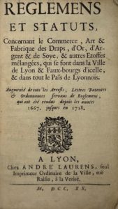 DRAPIERS — Reglemens et statuts, concernant le commerce, art & fabrique des draps, d’or, d’argent & de soyes, & autres etoffes mêlangées, qui se font dans la ville de Lyon & faux-bourgs d’icelle, & dans tout le Païs de Lyonnois.