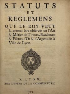 FILEURS D’OR — Statuts et reglemens que le roy veut & entend être observés en l’art & métier de tireurs, écacheurs & fileurs d’or & d’argent de la ville de Lyon. Lyon, aux dépens de la communauté, s.d. [1709]. – Extrait des registres de la Cour des Monnoyes. S.l.n.d. [Lyon, 1712]. – Recueil d’édits, déclarations, arrests, et ordonnances concernant l’art de tireurs, écacheurs et fileurs d’or et d’argent de la ville de Lyon.