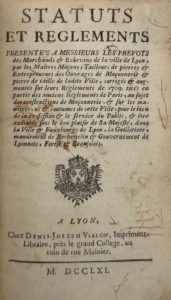 MAÇONS — Statuts et règlements, présentés à messieurs les prévôts des marchands et échevins de la ville de Lyon, par les maîtres maçons, tailleurs de pierres et entrepreneurs des ouvrages de maçonnerie et pierre de taille de ladite ville…