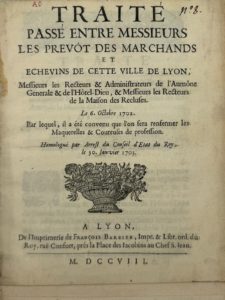 La première pièce a trait à la prostitution : Traité... par lequel il a été convenu que l'on fera renfermer les maquerelles et coureuses de profession (Lyon, F. Barbier, 1708).