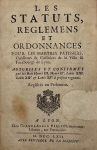 PÂTISSIERS — Les Statuts, reglemens et ordonnances pour les maistres pâtissiers, oublieurs & cuisiniers de la ville & fauxbourgs de Lyon.