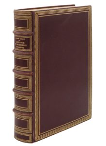 Saint-Denis, Impr. H. Bouillant, 1909. In-4, maroquin violet, filets et roulettes dorés en encadrement, dos orné de même, dentelle intérieure, tranches dorées, couverture et dos (Noulhac).Édition originale de cet ouvrage très complet sur l'industrie et le commerce de la soie, publié à l'occasion de l'Exposition franco-britannique de 1908 : coup d'œil d'ensemble sur l'industrie de la soie, ses origines, la fabrique lyonnaise, les autres centres de l'industrie, le rôle de Paris, les rapports entre la France et l'Angleterre, etc.