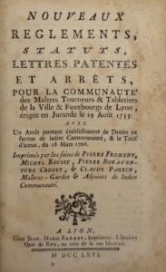 TOURNEURS — Nouveaux reglements, statuts, lettres patentes et arrêts, pour la communauté des maîtres tourneurs & tabletiers de la ville & fauxbourgs de Lyon, érigée en jurande le 29 août 1733.