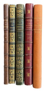 Les Figulines suivies du Rêve de l'escarpolette & de quelques autres pièces. Lyon, Scheuring, 1862. In-12, maroquin bleu, encadrement d'un triple filet doré, dos orné, tranches dorées sur témoins, roulette intérieure dorée, non rogné, couverture (Marius Magnin). Édition imprimée à 200 exemplaires sur les presses de Louis Perrin. Exemplaire enrichi d'un sonnet autographe et d'un dessin original signés de l'auteur. In-12, maroquin janséniste brun, tranches dorées sur témoins, roulette intérieure dorée, non rogné (David). Griffures. Autre exemplaire.