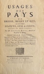 Le coutumier de Charles Revel avait été publié originellement à Mâcon en 1663, puis réédité avec des notes et des additions en 1729. Il est augmenté dans cette édition d'édits et de règlements intervenus jusqu'en 1775, des statuts de Savoie et d'une notice du pays de Gex d'après Philibert Collet, des deux premières parties de l'importante Histoire de Bresse et Bugey de Samuel Guichenon, etc.