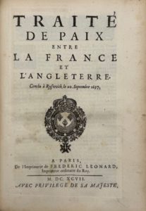 [Recueil de traités de paix]. Paris, F. Léonard, 1697. 8 pièces en un volume in-4, veau fauve, dos orné, tranches mouchetées (Reliure de l'époque). Recueil factice comprenant : Traité de paix entre la France et la Savoye. – Contrat de mariage de Mgr le duc de Bourgogne avec Mme la princesse de Savoye. – Traité de suspension d'armes en Italie. – Traité de paix entre la France et l'Angleterre. – Traité de paix entre la France et l'Espagne. – Traité de paix et de commerce, navigation et marine, entre la France et les états généraux des Provinces unies des Pays-Bas. – Traité de paix entre l'Empereur, la France et l'Empire. – Lettre du roy, écrite à Mgr l'Archevêque de Paris... pour faire chanter le Te Deum en l'église Notre-Dame... Toutes ces pièces ont été publiées par Fédéric Léonard en 1697, excepté la dernière, parue en 1696 chez F. Muguet. Ex-libris de Rosière de Champagneux à Bourgoin. Reliure usagée, coiffes manquantes, quelques rousseurs.