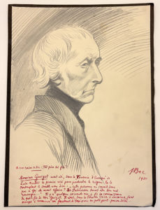 BAC Ferdinand : Dessin original signé, carricature de GUIZOT. Crayon et long texte signé et daté 1950 à l'encre rouge sous le portrait. 24x33 cm.