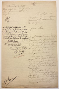BRILLAT-SAVARIN Anthelme : Apostille autographe signée en tant que Conseiller de S.M en la Cour de cassation pour accepter la demande d'un émigré de rentrer dans la gendarmerie. Document in-8, rédaction de Brillat-savarin en marge du document.
