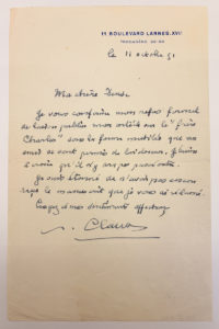 CLAUDEL Paul : Lettre autographe signée et adressée à une amie prénommée Denise. Il refuse la publication, sous forme tronquée, de son texte sur Charles de FOUCAULD. 1 page in-12.
