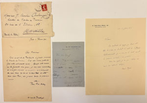 (ECRIVAINS DE MONTMARTRE) Ensemble de trois lettres autographes signées de Marcel AYME (11 juin 49, il décline une offre pour rédiger des contes), André WARNOD (3 novembre 1926 à Edmond HEUZE pour fixer un rdv afin d'évoquer un projet de livre...