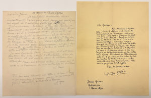 GIONO Jean : Lettre autographe signée et adressée à Madame DORIA (circa 1952). Il évoque ses déboires avec le peintre ZIMMERMANN pour l'édition illustrée de luxe de Angelo. Une lettre in-8 ainsi que le double de la lettre initiale de Madame Doria.
