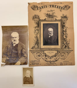 HUGO Victor : Photo de l'écrivain en 1864 par CARJAT (Etienne Carjat 1828-1906). Double albuminé 14x22 cm, annotations au crayon au dos et petites pliures. Jointes la reproduction de la photo en carte publicitaire pour le studio de Carjat 10 rue...