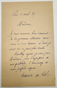 LECONTE DE LISLE Charles Marie : Lettre autographe signée et adressée le 3 avril 1887 à une dame pour la remercier de son intérêt pour l'auteur et son oeuvre. Une page in-12.