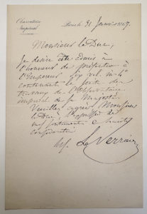 LE VERRIER Urbain : Lettre autographe signée et adressée le 31 janvier 1867 au Duc de MASSA. L'astronome français demande l'autorisation de rencontrer l'Empereur afin de lui présenter les 6 volumes contenant la suite des travaux de l'Observatoire...