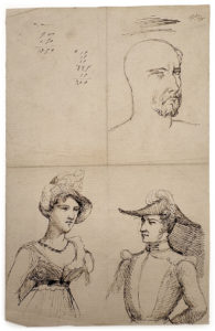 MERIMEE Prosper : Ensemble de trois dessins à la plume sur une même feuille in-12. Tête d'homme barbu et personnages de la Cour de Napoléon III.