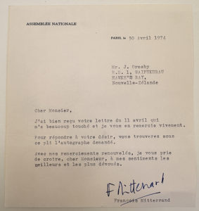 MITTERRAND François : Lettre tapuscrite signée et adressée le 30 avril 1974 à un ressortissant de Nouvelle-Zélande. IL le remercie de sa lettre et lui adresse un autographe demandé. Une page in-12.