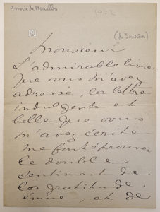 NOAILLES Anna de : Lettre autographe signée et datée 1902. Elle remercie son interlocuteur dans une belle et longue lettre en vers. 1 page in-12 recto verso.