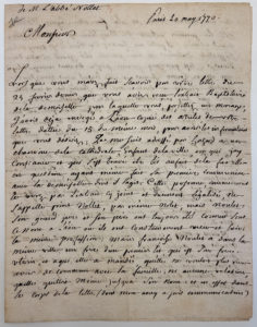 NOLLET Abbé : Amusante lettre autographe signée et adressée le 20 mai 1770 à une jeune fille nommée NOULET qui ne souhaite pas devenir parent et débute des démarches pour changer de nom. Une feuille in- 8 recto-verso.