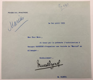 PAGNOL Marcel : Lettre tapuscrite adressée le 1Er avril 1955 à MORAZZANI l'autorisant à monter une tournée de Marius en Allemagne. 1 page in-1é.