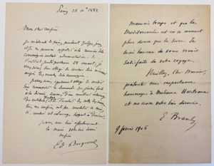 (PHYSICIEN) : Ensemble de deux lettres autographes signées de physiciens français. Edouard BRANLY, lettre adressée le 9 février 1906 à M. HURTEAUX pour le remercier d'un envoi de présent (1 page in-12) et Alexandre BECQUEREL, lettre adressée...