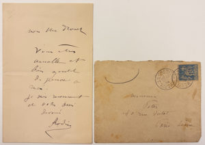 RODIN Auguste : Lettre autographe signée adressée à Monsieur DROUET. Il le remercie pour ses pensées. Une page in-12. Jointe une enveloppe autographe de la main de Rodin à Monsieur PETES.