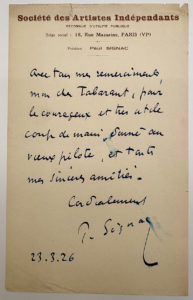 SIGNAC Paul : Lettre autographe signée et adressée le 23 mars 1926 à Monsieur TABARANT. Il le remercie pour son soutien et ses écrits. Une page in-12.