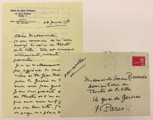 SOUPAULT Philippe : Lettre autographe signée et adressée à Mlle RINAUDO le 24 janvier 1971.IL regrette de ne pas avoir pu voir La guerre de Troie n'aura pas lieu de Giraudoux au théâtre de la ville. 2 pages in-12 avec enveloppe.