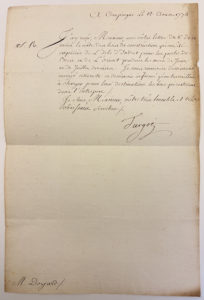 TURGOT Anne-Robert-Jacques Baron de l'Aulne : Lettre autographe signée et adressée le 12 août 1774 concernant le transport de bois de construction de l'isle d'Indret à Brest et Lorient. Une page in-8.