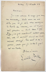 ZOLA Emile : Lettre autographe signée et adressée de Médan le 29 décembre 1885 à l'éditeur et Directeur de journal K.NILLSON. IL évoque son accord pour la publication d'un texte soit en volume, soit dans le journal Gil Blas. Une page in-12.