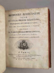 au libelle diffamatoire, signé, Guillaume Kornman. dont plainte en diffamation est rendue, avec requête, à M. le Lieutenant-Criminel, et permission d'informer (36 p., de l'imprimerie Clousier, Paris, 1787)... - Mémoire pour Louis Reingart, ci-devant comédien, et maintenant acteur et pensionnaire de l'Académie Royale de Musique, intimé et demandeur, contre messire Edme de Mont-Bayen, mestre-de-camp de dragons, chevalier de l'Ordre Royal et Militaire de Saint-Louis, et le sieur Pirere-Louis Marais, officier de dragons, petit-fils de la dame épouse dudit sieur de Mont-Baeyn, appellants et défendeurs. (34 p., de l'imprimerie Cailleau ,Paris, s.d.). - Défenses pour M. Linguet, sur la demande en réparation d'honneur et en dommages intérêts, formée contre lui au Chatelet de Paris, par le S.P. Le Quesne, marchand d'étoffes de soie (118 p., sind.) - Mémoire judiciaire pour le sieur Pierre Lequesne, marchand d'étoffes de soie, rue des Bourdonnois, à Paris, contre le Sr Simon-Nicolas-Henri Linguet, ci-devant avocat à Paris, demeurant actuellement à Bruxelles, délibéré à Paris le 27 janvier 1787 (86 p., chez Simon et Nyon, Paris, 1787) - Lettre du comte de Lally-Tollendal, datée du 20 septembre 1786, signature manuscrite de l'auteur (2 fnch.) - Résumé des plaidoyers, pour les porteurs-unis des lettres de change, acceptées par les Sieurs Tourton & Ravel, & Galet de Santerre contre les Sieurs Tourton et Ravel, et le Sieur Galet de Santerre, banquiers à Paris (75 p., à Paris, chez Prault, 1787) - Lettre du comte de Lally-Tollendal à Mrs du Conseil, date et signature manuscrites de l'auteur, Paris, 1er septembre 1786 (63 p.) - (Target) Consultation sur l'affaire de la Dame Marquise d'Anglure, contre les Sieurs Petit, au Conseil des Dépêches, dans laquelle on traite du mariage et de l'état des protestans, délibérée à Paris ce 20 juin 1787. Target. (164 p., à Paris, chez N. H. Nyon, 1787) Provenance : bibliothèque humaniste du Morbihan.