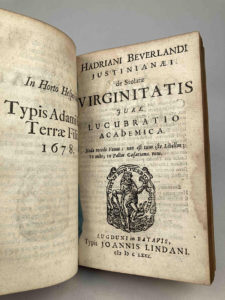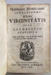 BEVERLAND, Adrian : Ensemble de trois rares textes de Beverland -ou contre lui- reliés en 1 volume in-12, plein vélin du temps, dos peint en vert. (6 ff), 223 pages (4ff). 109 pages, (2 ff). 56 pp, (2ff), 13 pages. I) De Stolatæ Virginitatis jure...