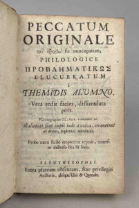 mors supérieur fendu. Quelques mouillures claires aux 2 premiers ouvrages.) - I) Peccatum Originale, sic nuncupatum philologice elucubratum Typis Adami Eva Terra Filii. In Horto Hesperidum. 1678. Edition originale. - II) De Stolata Virginitatis jure lucubratio Academica. Eleutheropolis, 1680. Dissertation scabreuse sur le célibat. Premières “recherches” de Beverland, qu'il garda plusieurs années secrètes avant de se risquer à l'apporter à l'imprimeur. Edition originale. - III) De Fornicatione Cavenda admonitio | sive adhortatio ad pudicitiam et castitatem | editio nova et ab autore correcta; Juxta exemplar Londinense. 1698. Provenance : Bibliothèque humaniste du Morbihan.