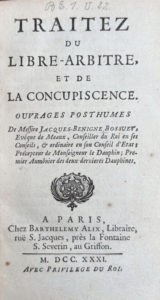 BOSSUET Jacques-Bénigne : Traités du libre-arbitre et de la concupiscence. Chez Barthelemy Alix libraire Paris 1731. Edition originale posthume de ce traité en deux parties, publiée par le neveu de l'auteur. Reliure in-12 plein veau, dos à 5...