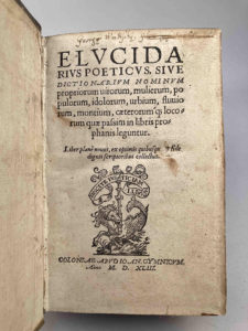 ESTIENNE, Robert : Elucidarius Poeticus, sive dictionarium nominum propriorum virorum. Mulierum, populorum, idolorum, urbium, fluviorum, montium, cæterumque locorum qua passim in libris prophanis leguntur. Cologne, Joannes Gymnicus, 1543. Petit...