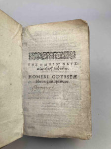 HOMERE: Homeri Odysseæ Libri Viginti Quatuor. [Ejusdem Batrachomyomachia, Hymni et Epigrammata] (Genève, probablement Eustache Vignon, vers 1600) In-16, (869 pp, (1 f. blanc), (20 ff) pour l'Index. Plein vélin souple à recouvrements, reliure du...