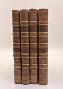 Louvet par M*. [XLIV-319, 360, 403, 429 pages] Imprimerie de Firmin Didot. 2 gravures par volume dont le frontispice. La seconde du tome 2, gravée à l'envers, le nom du dessinateur et du graveur à lire en miroir. Un graveur différent pour chaque gravure. 4 volumes in-8, demi-basane blonde à coins, dos à 5 nerfs orné de dorures, lettrines or, trois tranches jaspées, quelques frottements à la reliure, rares rousseurs intérieures, frais dans l'ensemble.