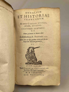 PITHOU, Pierre (1539-1596) : Annalium et Historiae Francorum | Ab anno Christi DCCVIII. ad ann. DCCCCXC | Scriptores cotanei XII. | Nunc primum in lucem editi | Ex Bibliotheca P. Pithoei. Paris, Claude Chappelet, 1588 2 parties en 1 vol. in-8, (6...