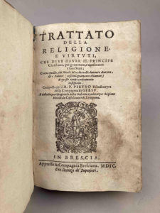 RIBADENEYRA, P. Pietro (1527-1611) : Trattato della religione e virtuti, che deve haver il principe Christiano, per governare, e conservare i suoi Stati ; contra quello, che Nicolo Machiavelli, dannato Auttore, & politici (cosi indegnamente chiamati)...
