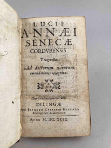 SENEQUE : Lucii Annai Seneca Cordubensis Tragcdia Dillingen, Joannis Gasparus Bencard, 1699. In-12, 416 pages. Plein maroquin bordeaux, dentelle à froid sur les plats ; rosace centrale ; toutes tranches dorées. Reliure du temps. Traces d'argenture...
