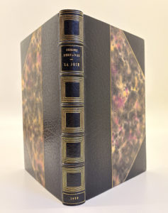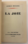 BERNANOS Georges : La joie. Plon Paris 1929. E.O. L'un des 82 ex. de tête sur Japon avec 27 Chine. Très bel reliure in-8 demi maroquin noir à coins, dos à 5 nerfs, caissons or, tête dorée, couvertures conservées (reliure de Semet et Plumelle).