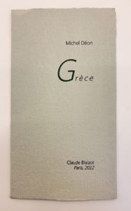 DEON Michel : Grèce. Editions Blaizot Paris 2012. E.O. L'un des 60 ex. de tête sur papier murier. Ex. signé par l'auteur. En feuilles in-8 étroit, état de neuf.