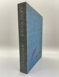 DUFY Raoul/LA VARENDE Jean de : Les centaures et les jeux. De Tartas éditeur Paris 1957. E.O. L'un des 130 ex. sur Arches. En feuilles in-4 sous boîte plein papier bleu ciel, dos légèrement éclairci.