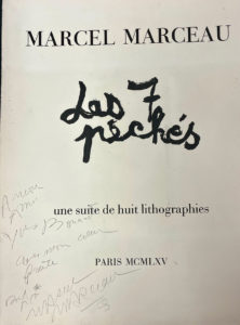 MARCEAU Marcel (dit mime marceau) : Les sept péchés. S.n. presses de Jean Pons, Paris 1965. E.O. Complet du texte, du frontispice et des 8 lithographies, chacune justifiée et signée par l'artiste. Tirage limité à 110 ex., celui-ci l'un des 100...