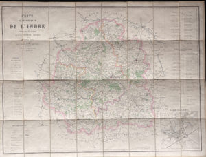 ERHARD, 12 rue Duguay-Trouin. Carte du département de l’Indre en couleur, librairie Nuret Châteauroux 1872. Légendée, plan de Châteauroux. Thuillier imprimerie au dépôt de la guerre carte dépliante en noir et blanc du Puy légendée. Carte...