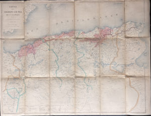 REGNIEY, 105 boulevard de Reine. Carte dépliante des chemins de fer de l’Algérie dressée aux ministères des travaux publics, en couleur, légendée, 1880.