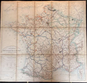 Monsieur le comte de RUOLZ, Paris août 1869. Carte dépliante en couleur générale pénétration des Houilles Anglaises à l’intérieur de la France, légendée.