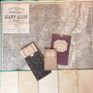 Suite de quatre cartes dépliantes. - V.BERGER-LEVRAULT & FILS. Carte dépliante en couleur topographique du département du Haut-Rhin. - LANEE. Carte dépliante de la ville de Reims. - LANEE. Carte dépliante de la ville de Strasbourg. - Carte...