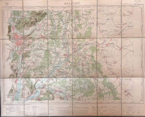 Ensemble sept de cartes dépliantes en couleur des régions est de la France comprenant une carte du territoire de Belfort, une nouvelle carte de Franche Comté 1845, carte de Sens, une carte de la Région de Bar-le-Duc, une carte de la région...