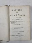 veau fauve raciné époque, dos ornés et dor. Portrait gravé - JUVENAL. Satires traduites par Dusaulx. Paris, Dalibon, 1821. 2 vol.in- 8 veau blond glacé époque, dos à nerfs ornés et dor., cadre de fil. à fr. et motif losangé central à fr. sur les plat, tr. dor. Mors supérieur fendu au tome I. Rousseurs. Ens. 3 ouvr. en 5 vol.