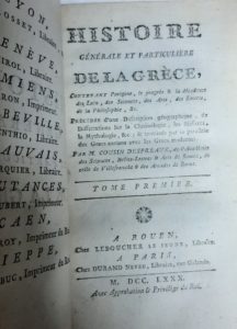 COUSIN DESPREAUX. Histoire générale et particulière de la Grèce. Rouan, Paris, 1780-1789.16 vol. in 12 basane époque, dos ornés et dorés. ?Edition originale. Bien complet du tome 16 qui manque souvent
